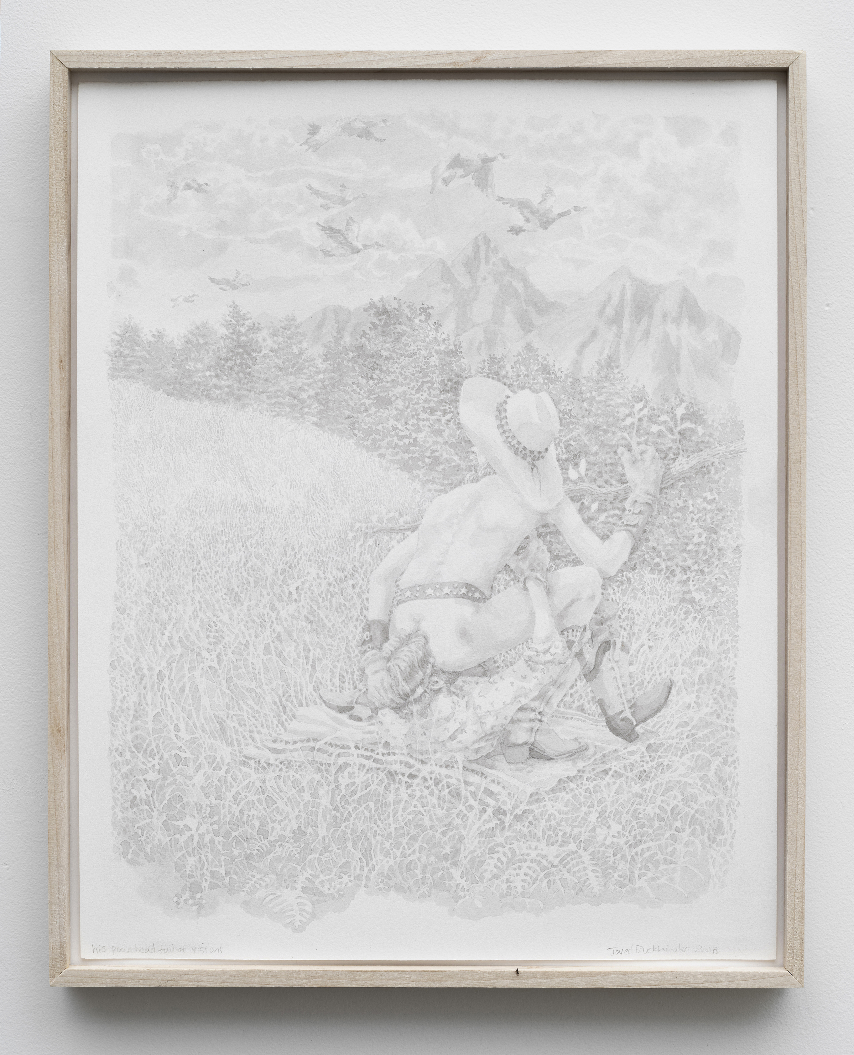 Four oil paintings show Dorothy’s windblown house, come to rest with finality in a variety of attitudes atop unfortunate cowboys, themselves depicted only as blue jeans and boots jutting out of the domestic rubble. Two figurative vessels – referring both to Moche ceramics and trucker’s long-haul piss-pots – are adorned with sculpted shoulder pads and jock straps. They are titled Urinal End and Urinal Guard. The drawings are a rogue’s gallery of cowpokes, parole violators, and vagrants. Together the works traffic in images of, quoting the curator, “Americana, men in homosexual acts, and a hint of the Midstate pastoral.” They are, “a bravely unglamorous look at the emotional refuse of American Life, or conversely, a fading echo of a once promissory gay erotica.”